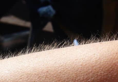 我们的皮肤表面长着汗毛,而每一个毛孔下都有一条竖毛肌,当受到神经刺激(例如:生气、害怕、受凉等情况)后,身体的温度会下降,而竖毛肌便会收缩而令毛发竖立起来,形成鸡皮疙瘩。除了有着保温的作用外,这个生理系统亦可使动物的体型看起来比实际更大,从而吓退敌人。