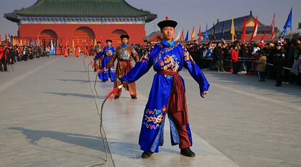 「静鞭」(又称鸣鞭)的仪式,最早起源于契丹民俗,以鞭「驱鬼」,在唐末以及五代十国之后,开始仪式化,成为皇权专属的仪式之一。清朝延续各代的仪式,有了更为详细的静鞭仪式,目前这种「静鞭」仪式已经在国家级别的正式场合「废除」,然而依旧残留在不少满族歌舞之中(比如三鞭舞)。