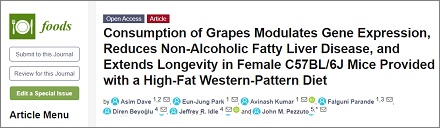 来自美国长岛大学和西新英格兰大学的 Asim Dave和John M. Pezzuto 教授等人发现食用葡萄可以调节基因表达,减少非酒精性脂肪肝,延长高脂肪饮食的雌性小鼠寿命。该研究已发表于知名期刊《Foods》上。