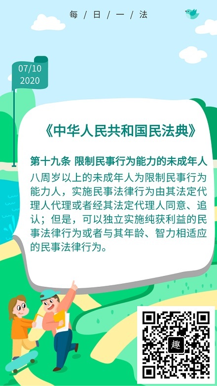 八周岁以上的未成年人为限制民事行为能力人,实施民事法律行为由其法定代理人代理或者经其法定代理人同意、追认;但是,可以独立实施纯获利益的民事法律行为或者与其年龄、智力相适应的民事法律行为。