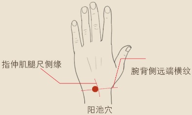 中指点阳池穴,缓缓向下用力。刺激阳池穴要慢慢进行,时间要长,力度要缓。